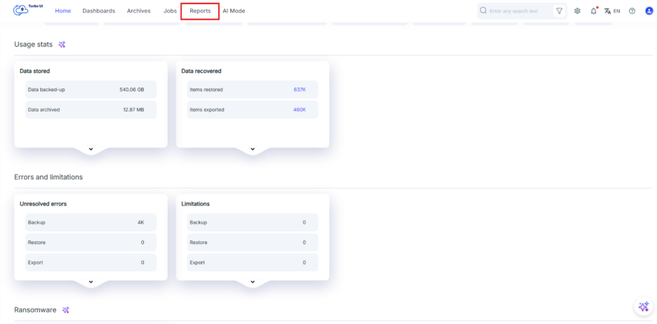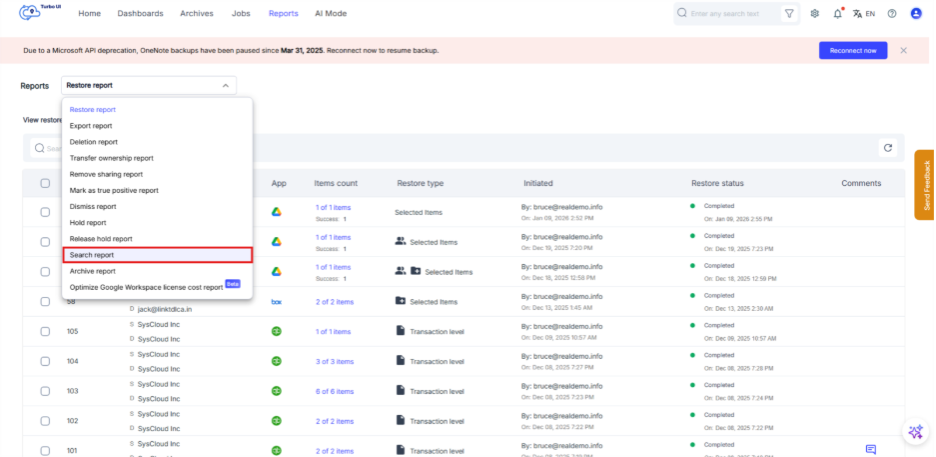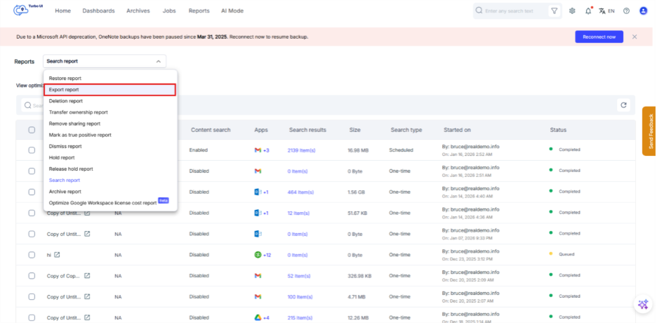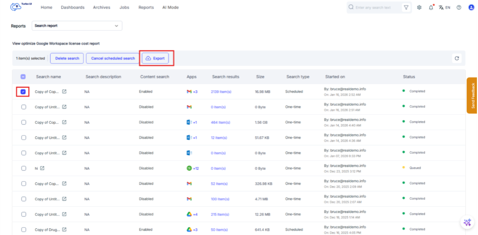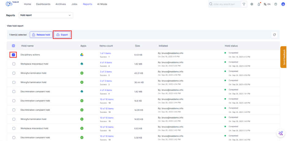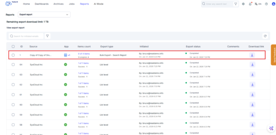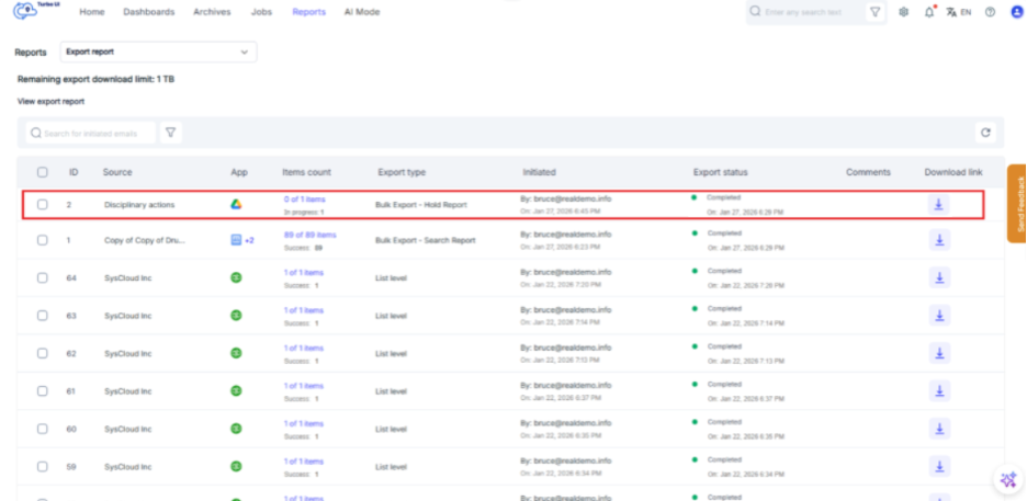 Step 6: The export request appears in the Export report. The download link is generated once the export is complete.