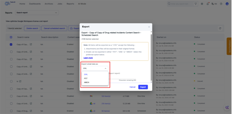 Step 4: Choose the export format for emails and select “Export” to confirm. Available formats for email export: