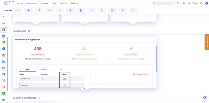Step 1: From the “Dashboards” page, select the ransomware/encrypted alert in the ransomware widget to open the ransomware search results page.