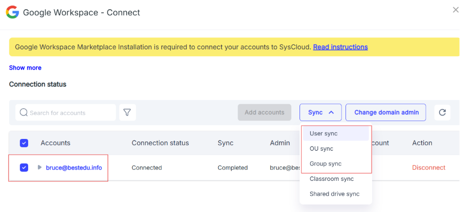 Follow the steps below to perform on-demand a sync for users, groups, or OUs in your domain using the SysCloud application: