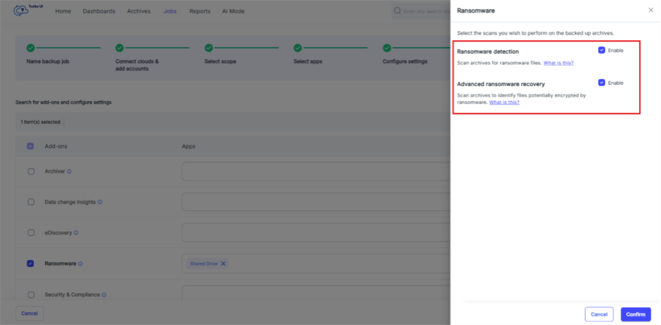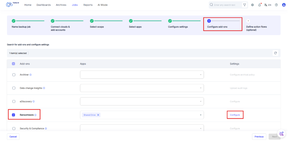 Step 1: Locate “Configure add-ons” in “Jobs” and enable “Ransomware”. Select “Configure” to choose the ransomware scans you want to perform.