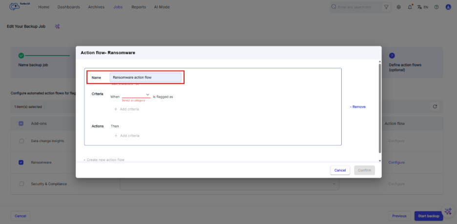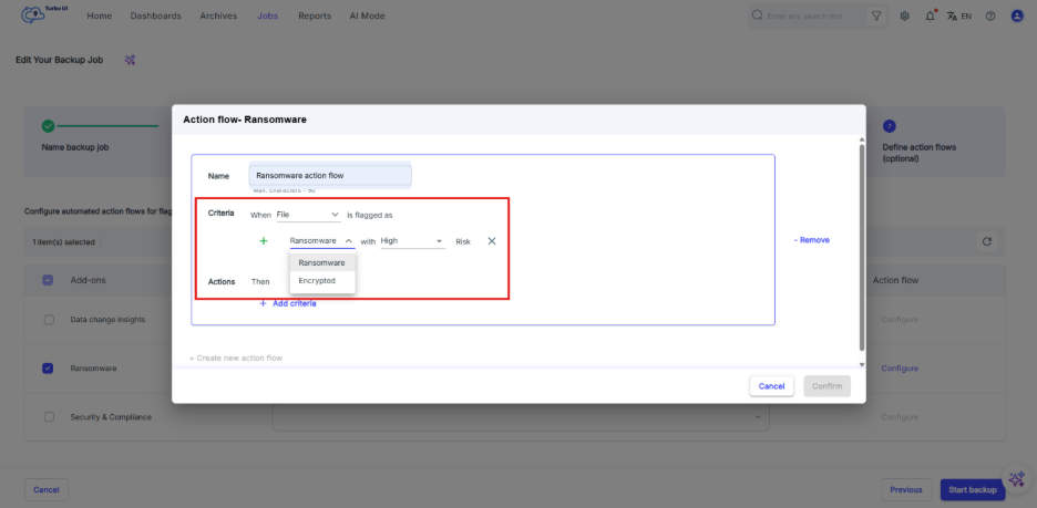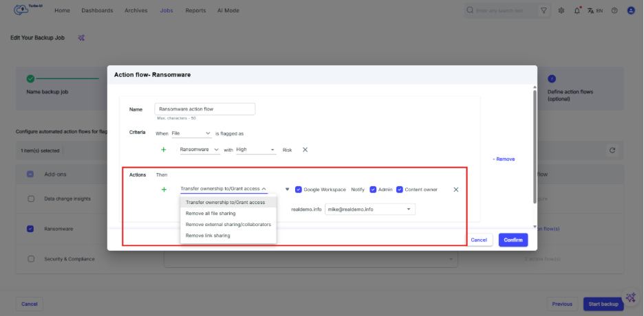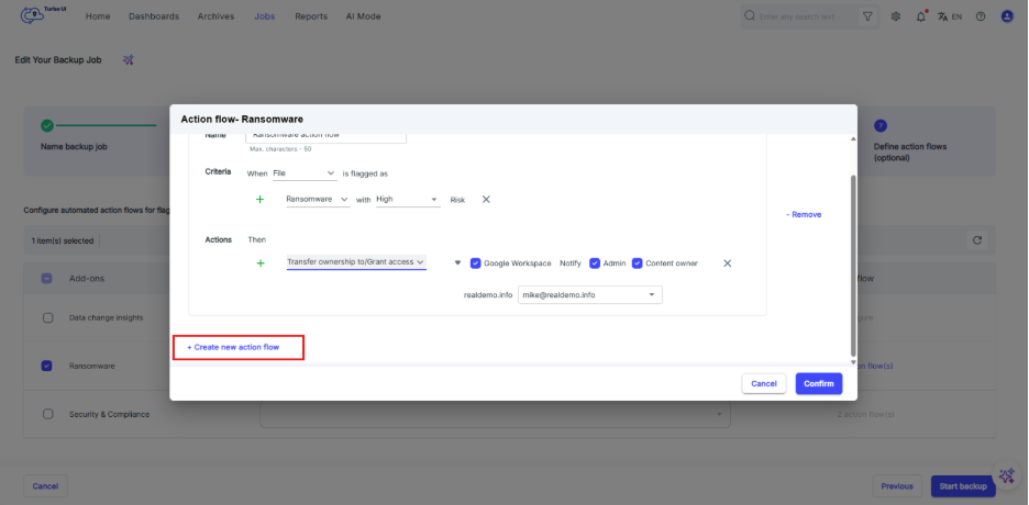 Step 8: Enable the action flow by selecting “Confirm”. Once you select “Start backup”, the action flow will run based on the configured criteria and actions.