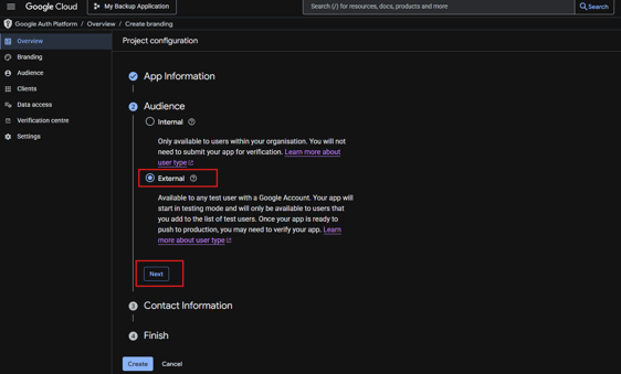 - External: Choose this option (recommended for most applications). This allows you to create an application that can be used by anyone with a Google account.