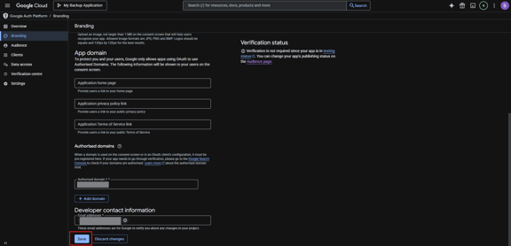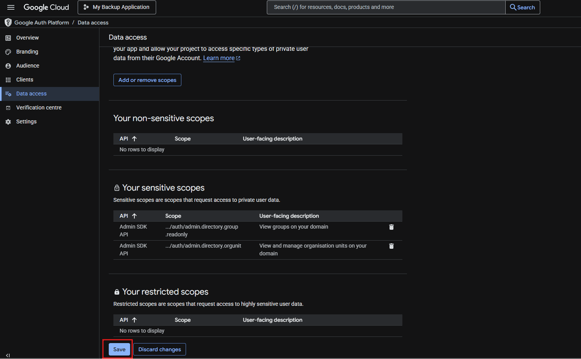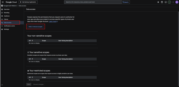- Application Name: Enter your application's name (e.g., "MyCompany Backup Service"). This will appear on the consent screen, so make it something users will recognize.