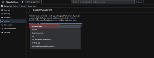 Note: If you get a message about creating an OAuth consent screen first, you need to go back to PHASE 2 and complete those steps first - Select your "Application type", as Web application