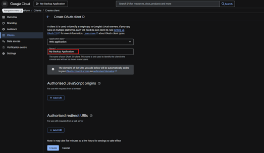 - Enter a Name for your credentials (e.g., "My Web Application" or "Backup Service OAuth")