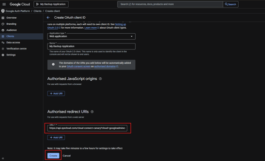 Your Redirect URI: https://api.syscloud.com/cloud-connect-canary?cloud=googleadminconsole- Important requirements that this URI meets: