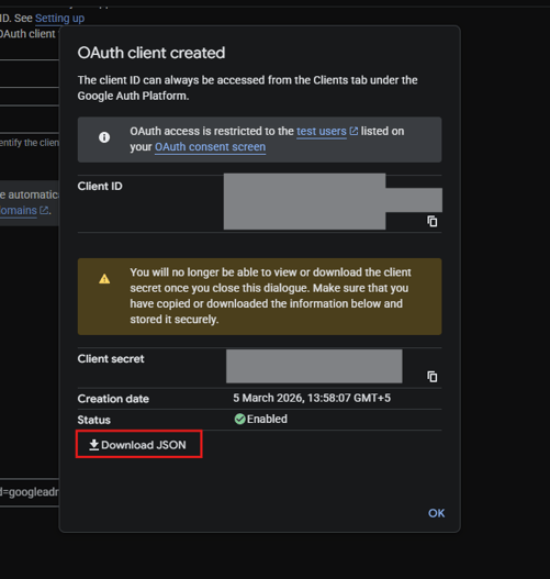 - Download the JSON file: Click the download button to save a JSON file containing your credentials. This file looks like: