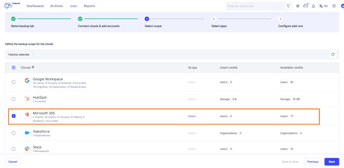 Step 6: To define the scope of the backup job, select “Microsoft 365” from the clouds list, and click on “Select” under Scope.