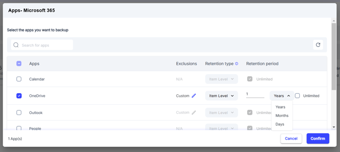 - If you want the items retained only for a certain period of time, uncheck the box under “Retention period” and specify the number of days, months or years for which you want the items retained. You can also select to have item level retention or snapshot level retention for OneDrive backup. Learn more about retention types.