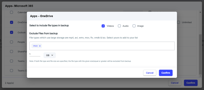 - You can also choose to exclude certain file types or file sizes in Outlook, OneDrive, SharePoint, and Teams. Click the pencil icon beside the app name under “Exclusions” and specify the desired exclusions.