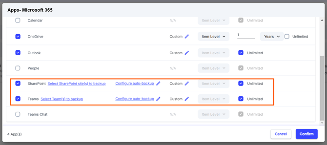 - To exclude any app from the backup job, click the checkbox next to it to remove it from the selection. You can choose to specify which SharePoint Sites and Teams to back up by clicking the hyperlink beside the app name under Apps.