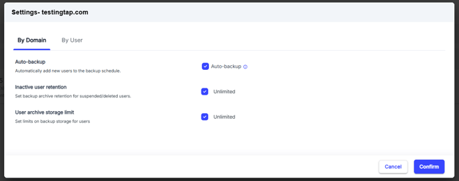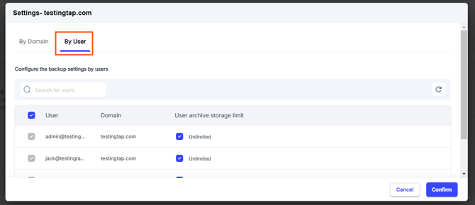 - To configure user level settings, select the “By User” tab. Click on the checkbox below “User archive storage limit” to set limit on backup storage for users. It will be automatically set to unlimited.