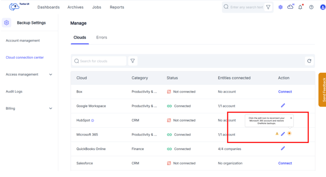 - クラウド接続センターに移動します。ホットスポットインジケーターで強調表示されたMicrosoft 365接続カードを見つけ、「編集」をクリックします。