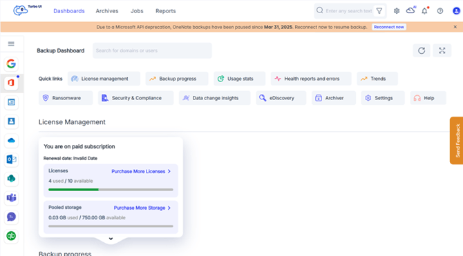 アカウントの再認証が完了すると、SysCloud は自動的に OneNote ノートブック、セクション、ページのバックアップを再開します。