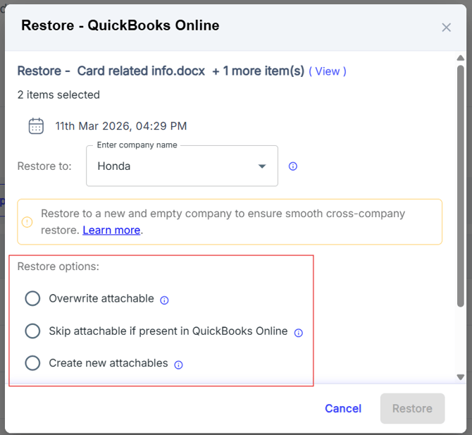 Overwrite attachable – If the selected attachable already exists in QuickBooks Online, it will be replaced with the version available in the backup snapshot. If the attachable does not exist in QuickBooks Online, a new item will be created with ‘SysCloud’.