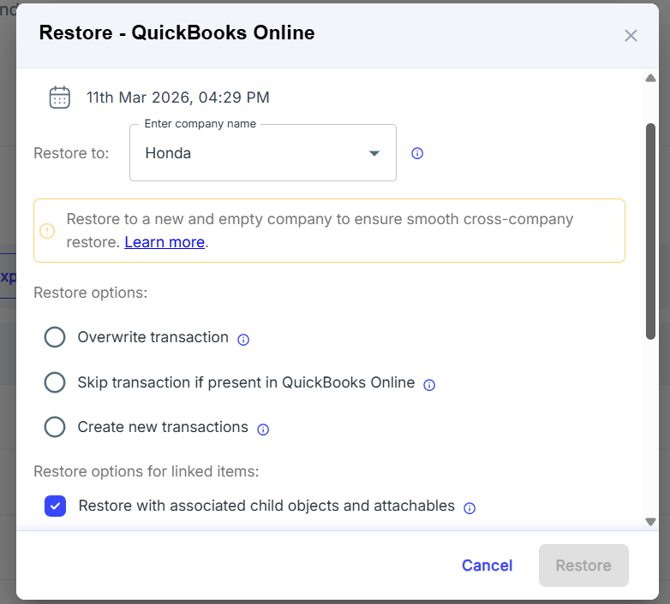 Step 7: Under Restore options for linked items, select Restore with associated child objects and attachments if you want to restore the related child objects and attachments along with the selected transaction.